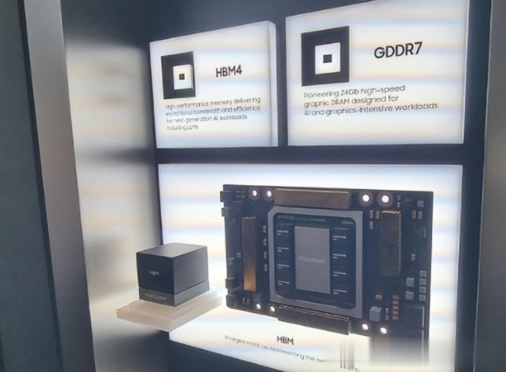 将HBM4与GDDR7显存芯片并排陈列在一面墙上,吸引了众多目光。